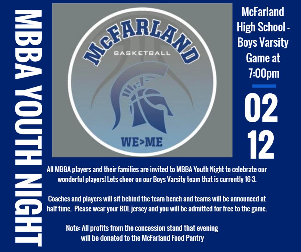 The MBBA is a non-profit organization that was founded in 2012 to serve the boys youth basketball needs of McFarland. The association and its coaches are made up of parent volunteers who work to support youth basketball opportunities within McFarland. If you are interested in volunteering for a leadership or coaching position, please contact Joe Punzel (coaching).